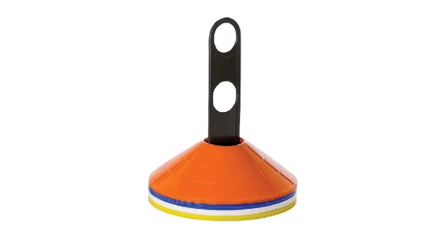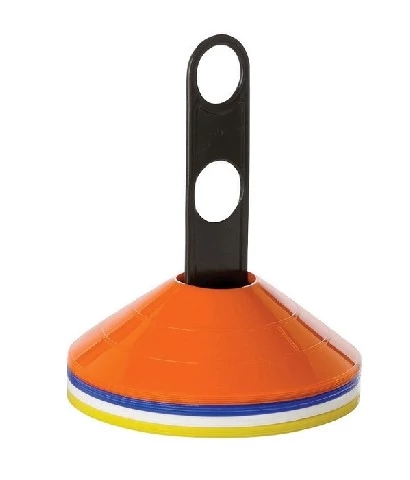 Комплект конуси тип „диск“, изработени от устойчив и гъвкав пластмасов материал, за тренировки по отборни спортове, маркиране на игрище и координационни упражнения. Комплектът включва и практичен пластмасов държач за лесно пренасяне и съхранение.