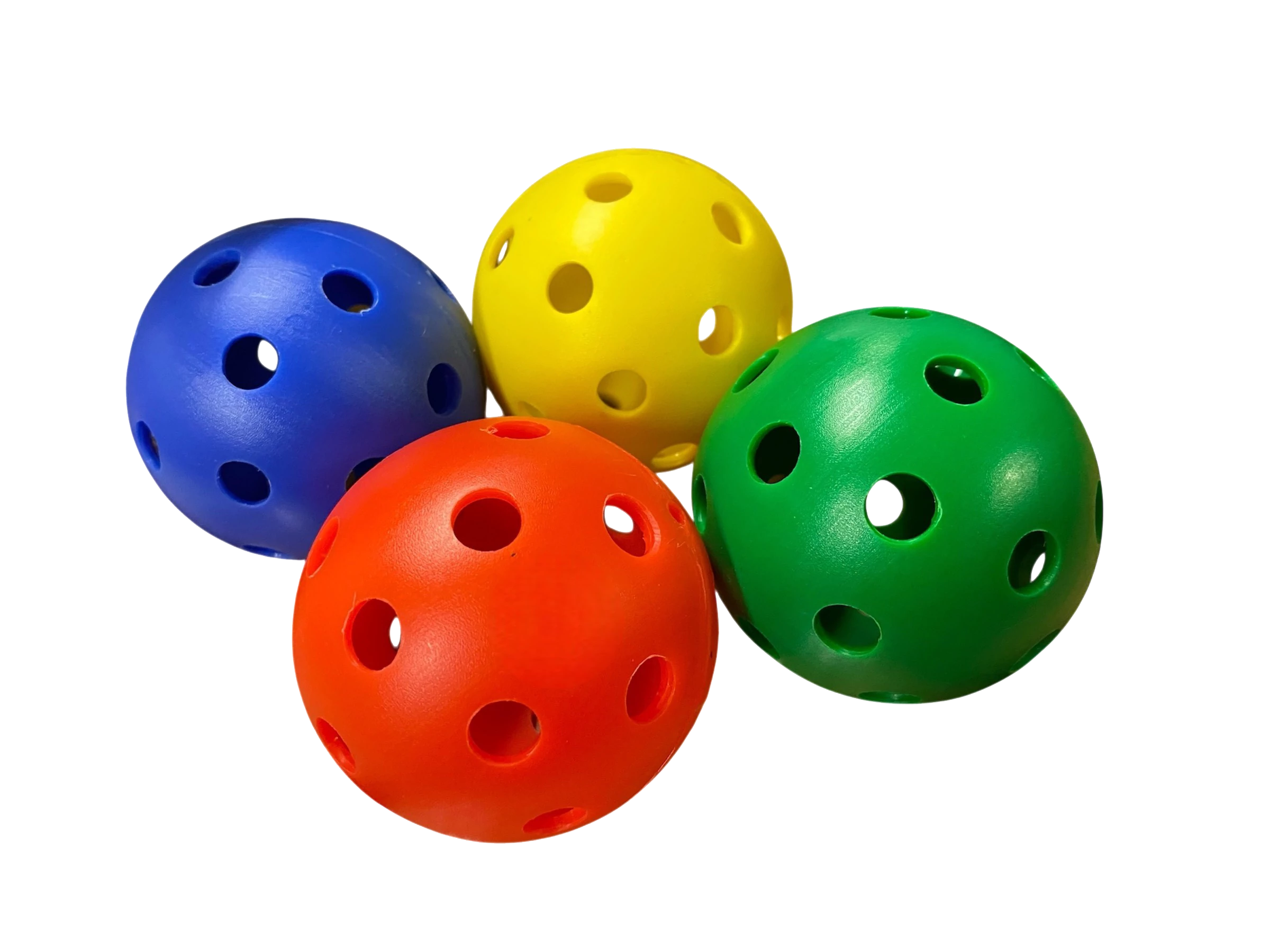 Лека, перфорирана флорбол топка в смесени, ярки цветове – за тренировки, училищно физическо възпитание и игра в свободното време.