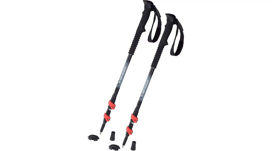 3-частна алуминиева трекинг туристическа щека (18-16-14 мм) с регулируема дължина (65-135 см), с амортисьор, със сменяем (трекинг) гумен накрайник. Каишката за китката държи ръката, класическа дръжка на щека за ходене.