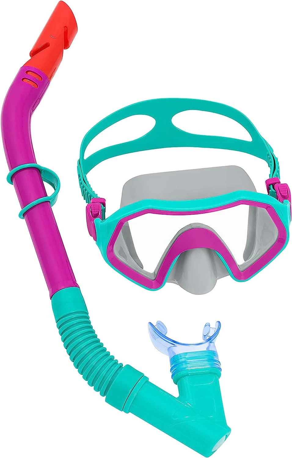 Удобна детска маска за гмуркане с шнорхел. С поликарбонатно стъкло, UV защитно покритие и хипоалергенни поливинилови пластмасови части, които прилягат комфортно към лицето. Благодарение на регулируемите каишки маската лесно се напасва към главата на потребителя. Конструкцията на шнорхела предотвратява обратно навлизане на вода. Без латекс!