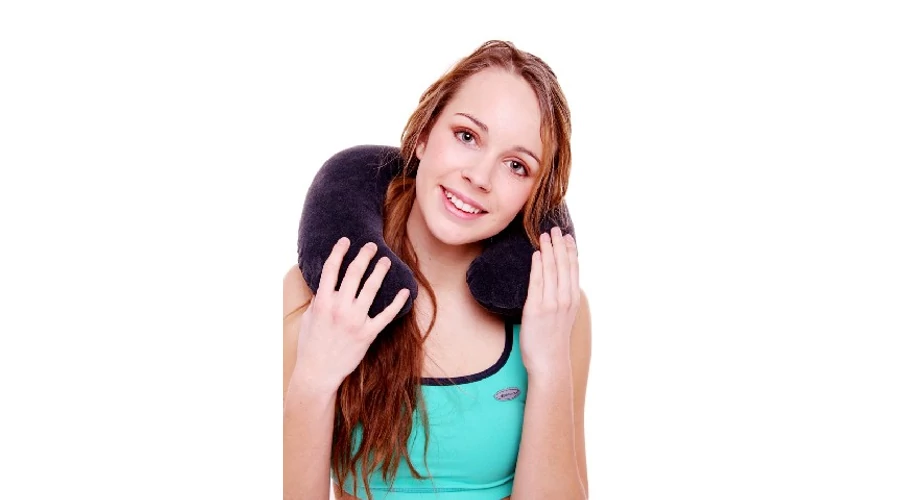 Надуваема възглавница за врат с велурено покритие, в сив цвят. Размер: 36×30×10 cm.